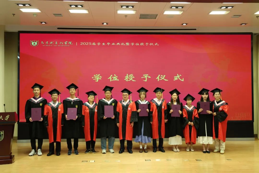 马克思主义学院2025届学生毕业典礼暨学位授予仪式在杜厦图书馆报告厅成功举办。学院党委书记时昱老师、院长王建华老师,副院长吴翠丽老师、倪春纳老师、李乾坤老师,学院学位评定分委员会委员王明生老师、戴雪红老师、熊秋良老师、暴庆刚老师,青年教师代表王楠老师、周瑞瑞老师,辅导员刘晶月老师出席典礼。典礼由学院党委副书记夏娟老师主持。