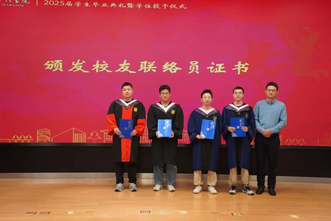 优秀毕业生代表颁发优秀毕业生荣誉证书,倪春纳老师为2025届校友联络员孙经纬、李志远、刘晨、蔡恺翔同学颁发校友联络员证书,时昱书记为毕业生党员代表颁发毕业生党员纪念卡。