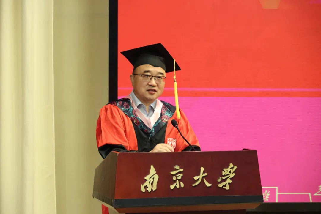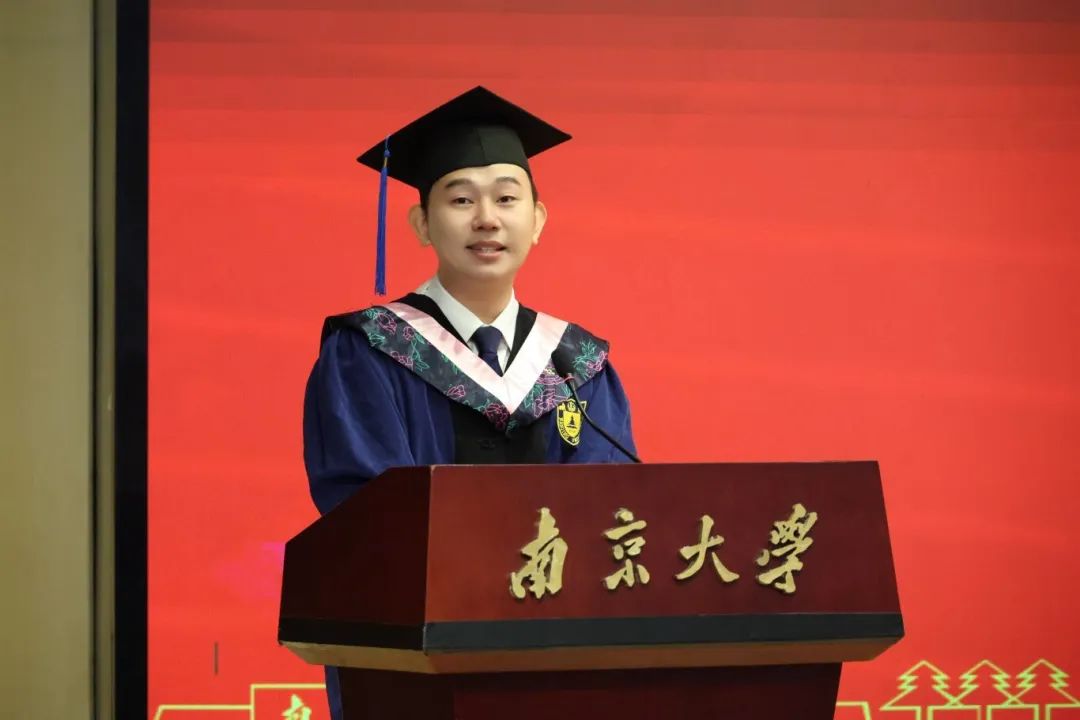 博士毕业生代表范佛山同学则用“感想”“感谢”“感悟”三个关键词,回顾了七年南大时光。在谈及感想时,他回忆了可敬师长的托举、可喜的学院发展与可爱的南马学子;在表达感谢时,他感谢恩师王建华教授的学业指导与生活关怀,感谢同窗陪伴与家人支持。最后,范佛山分享自己的感悟。他认为,立志当立长志,并终其一生为之奋斗;在前行的道路上,既要以“静”积蓄力量,也要以“争”争取价值;而面对离别,则应将不舍化作动力,以进步酬报这段难忘的时光。