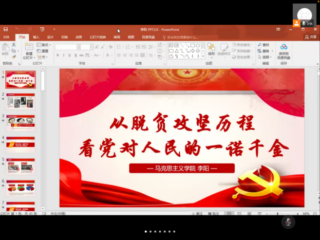 2020级硕士生李阳作题为“从脱贫攻坚历程看党对人民的一诺千金”的宣讲报告,通过展现党如何坚持领导人民摆脱贫困以及如何带领广大贫困人口脱贫的历程,深刻揭示了脱贫攻坚战这一亘古未有、彪炳千秋的历史功迹,展现了中国共产党人不忘初心、砥砺前行、如期带领全体人民脱贫的光辉形象和为全体中国人民谋福祉的高度责任感和使命感。
