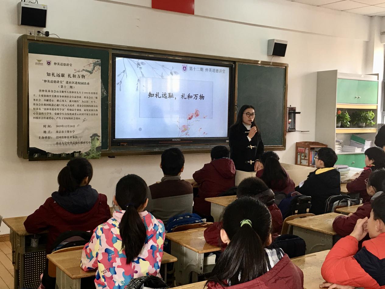 第十二期“仲英道德讲堂”进社区进校园活动于南京市立贤小学拉开帷幕。本次中华优秀传统道德讲堂活动以“知礼远耻,礼和万物”为主题,南京市立贤小学40余名师生踊跃参与其中,学习优秀传统礼仪,感悟中华文化魅力。
