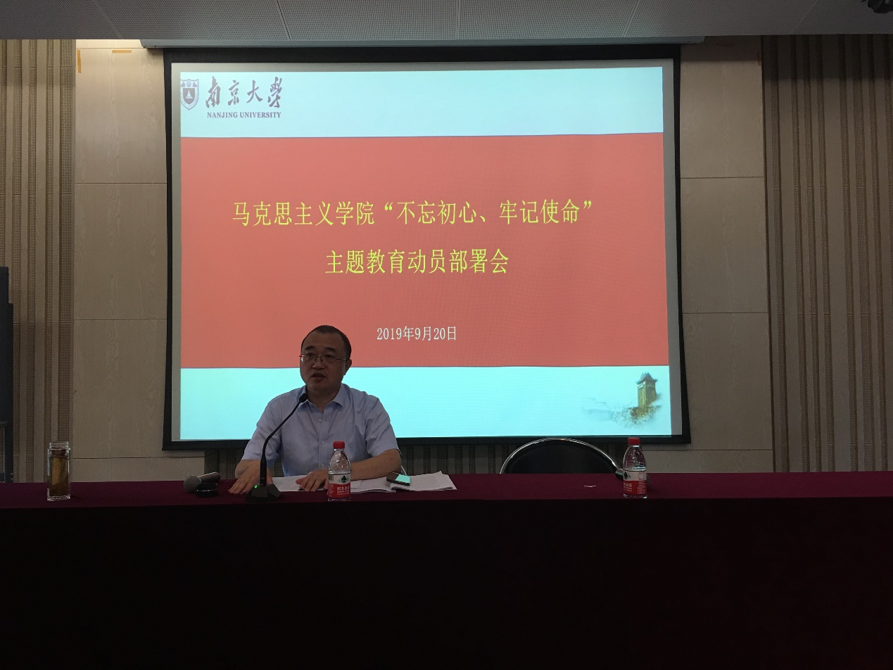 “不忘初心、牢记使命”主题教育动员会上的讲话精神。王建华书记指出,为让主题教育活动往深里走、往心里走、往实里走,学院党委特成立“不忘初心、牢记使命”主题教育领导小组。王建华书记宣读了学院成立“不忘初心、牢记使命”主题教育领导小组的通知并梳理了主题教育活动的工作要点,就学院领导班子和基层党支部、党员同志分别提出要求与期待。主题教育自9月始,11月底基本结束。期间学院领导班子需完成成立领导小组及办公室、召开主题教育动员大会、制定个人学习计划、开展集中学习研讨等12项任务;党支部和党员需在学院党委指导下完成专题党课、志愿服务、民主评议等11项任务。王建华书记将主题学习的时间表和规划图,清晰地传达给全体党员,并特别强调主题教育活动注重统筹结合,需与新中国成立70周年大庆结合起来,与学院融合党建工作结合起来,结合实际抓实效。王建华书记对全体党员同志提出希望:希望每一位党员同志都能主动、积极地投身主题教育,锤炼忠诚担当的政治品格,在新时代下不忘我党的初心、更加自觉地承担共产党员的职责与使命。