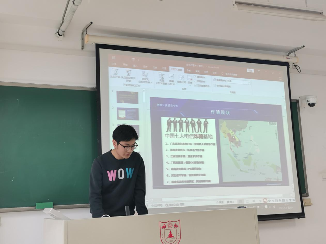 此外,为强化支部成员反诈意识,支部开展了反电信诈骗宣传,由第二团支部书记陈政昊对日常生活中常见的电信网络诈骗犯罪类型及手法进行介绍与分析。首先,他为支部成员详细介绍了全省高发电信网络诈骗犯罪类型及网络诈骗犯罪分子惯用手段,具体分析了电信诈骗案件的发案特点、方式以及如何识别、应对等;其次,他根据不同类型的诈骗案选取典型案例进行具体描述,揭露电信诈骗“套路”,并提醒大家不要轻信陌生人,更不要向陌生人账户转账汇款,增强了支部成员的防诈骗意识;最后,他向支部成员宣传打击整治电信诈骗等相关法律知识,从多个角度详细介绍了如何进一步增强防范电信诈骗意识,增强防范电信诈骗能力,遏制电信诈骗高发态势。