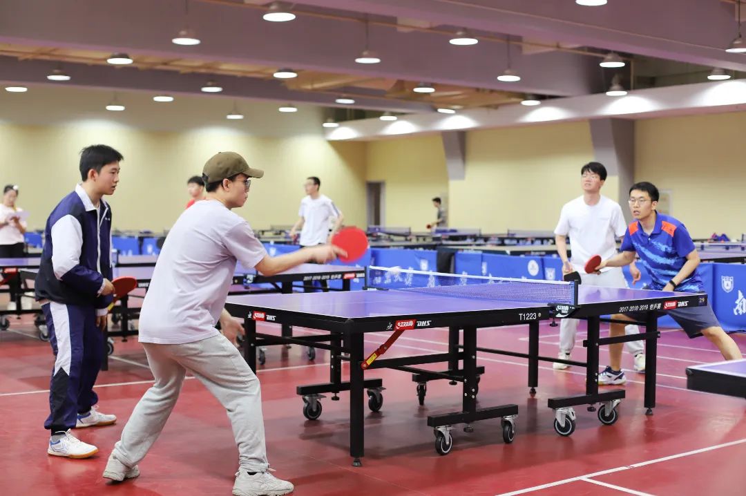 首先进行的男子单打对决便紧张激烈、扣人心弦、“好球”不断。削球、扣球、旋球、弧线球,挥拍落拍间尽显对力量、节奏和落点的透彻掌控。所有选手沉着应战、奋力拼搏,大家献上了一场场视觉的盛宴:有武海宝老师和崔舒畅同学高潮起伏的强强对决,彼此你来我往、见招拆招;也有崔晋同学以精准发球、娴熟接球、迅猛扣球连赢数轮,用完美的防守和绝杀点燃赛场,都将国球的魅力展现得淋漓尽致。最终,崔晋同学斩获本场比赛冠军,武海宝老师和贾一帆同学并列男单亚军,张显玉同学获得了比赛季军。