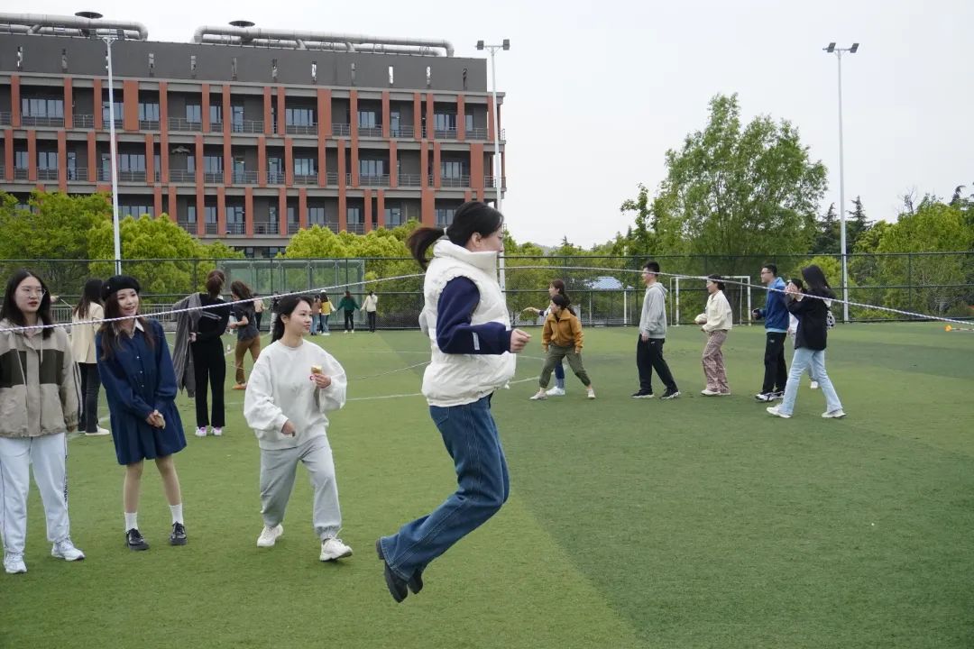 下面,我们来到“绳”采飞扬跳大绳项目。这是一项考验速度、技巧与团队默契的运动。但运动员们矫健的身影,轻盈的跳跃,伴随着跳绳砸地的有序声响,共同谱写着一曲青春的赞歌。2021级本科班与2022级硕士一班之间的较量相当激烈,分别取得两分钟87跳与80跳的好成绩。第一名由2021级本科班收入囊中。