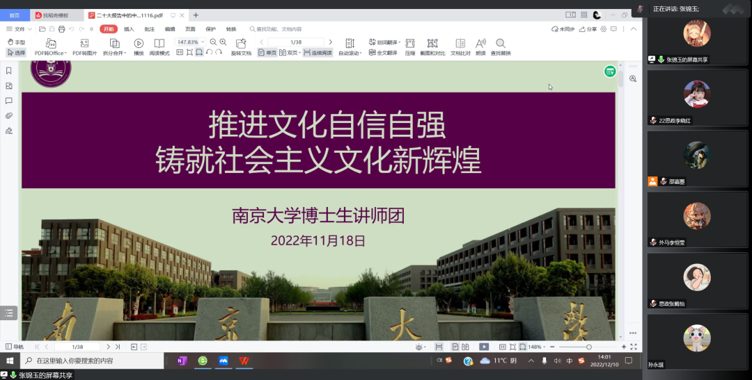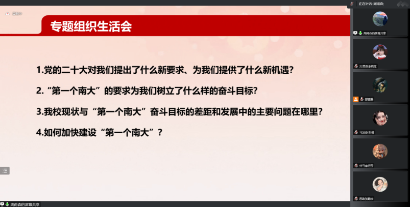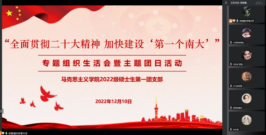 2022级硕士生第一团支部开展“全面贯彻二十大精神 加快建设‘第一个南大’”专题组织生活会暨主题团日活动,通过全员参与、广开言路,聚焦问题、建言献策,充分讨论、集思广益,不断增强共青团组织引领力、组织力、服务力,进一步引领班级青年参与建设有中国特色、南大特质、时代特点的“第一个南大”。本次活动采用线上形式,由2022级硕士生第一团支部书记邵嘉曌、副书记周甫森、组织委员张睿思共同主持,麻豆传媒
