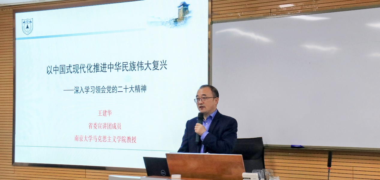 王建华教授以“中国式现代化推进中华民族伟大复兴——深入学习领会党的二十大精神”为主题对党的二十大精神进行了系统阐释和深入解读。首先,王建华教授整体介绍了党的二十大报告的主题和主要内容,对二十大报告中“伟大建党精神”、“团结奋斗”等理论成果进行了深入分析和阐释。王建华教授以大历史观把握时代大势,采用历史和现实相互映照的方法着重阐释了“伟大建党精神”的历史渊源和现实意义,勉励参会党员发掘历史经验,关注社会现实,注重运用和发扬党的伟大精神解决实际问题。