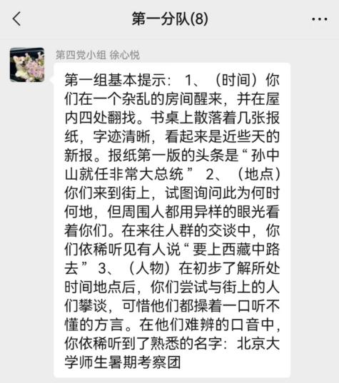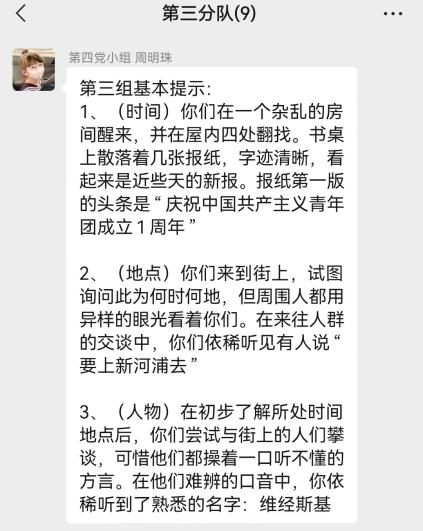 支部成员分享完毕之后,第四党小组成员根据各分队积分情况,发放基础提示和特殊提示至每个分队。各分队根据提示来定位队伍在这次时空旅程中穿梭到了党的奋斗历程中的何时何地。