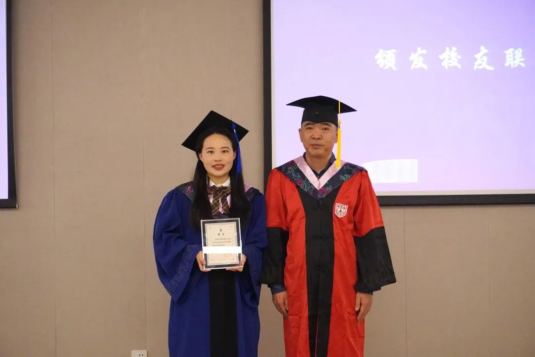 胡大平院长为2019级硕士研究生谢宇嘉宁颁发校友联络员证书。王建华书记为党员代表颁发毕业生党员纪念卡。