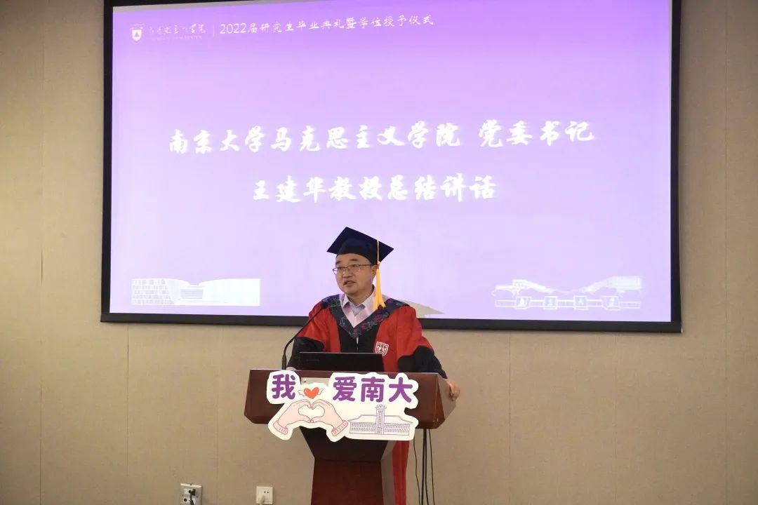 学院党委书记王建华教授作总结发言。王建华教授对为培育“德才兼备”的学生所辛勤付出的老师们表示感谢。他希望全体毕业生做“大写的人”,一要孝敬父母,常回家看看,常回母校看看;二能够时刻保持作为“南大人”的自我要求;三是“唯有心怀国之大者方能有所成就”,须心系国家大事、勇担社会责任;四是牢记历史使命,麻豆传媒