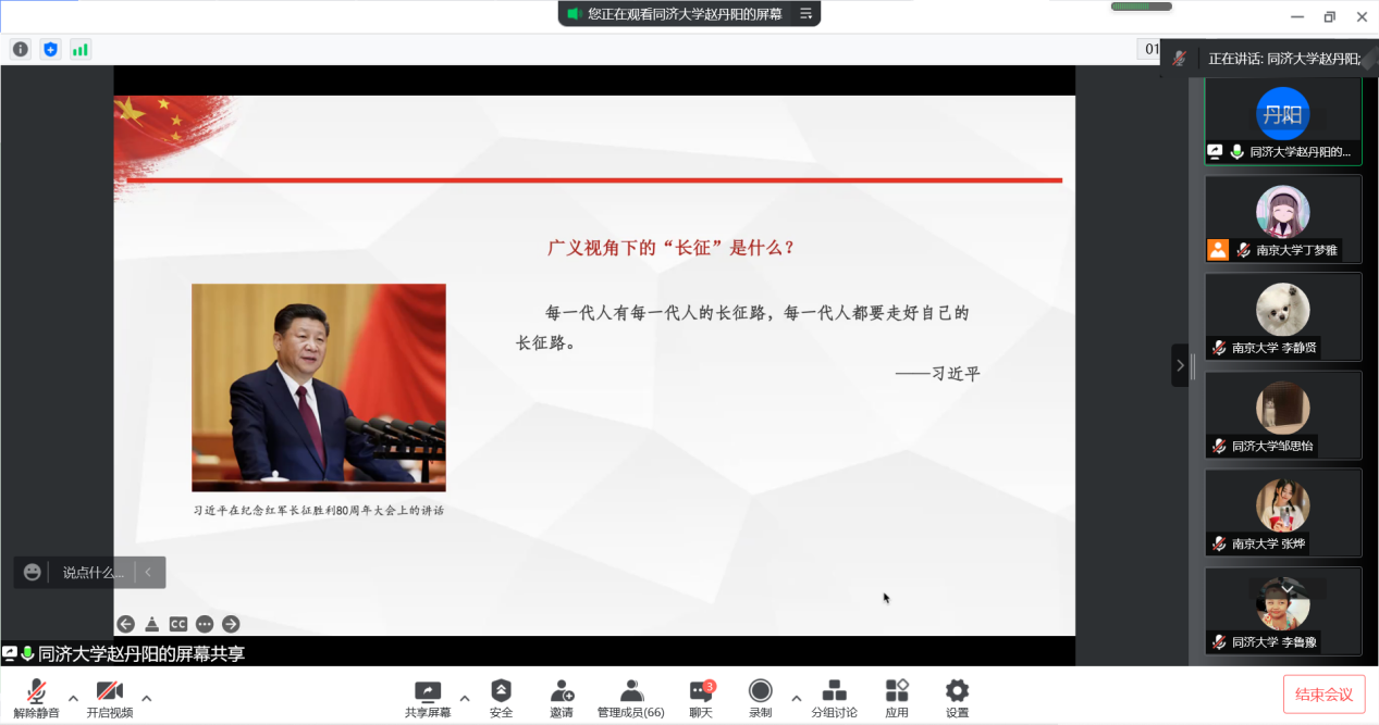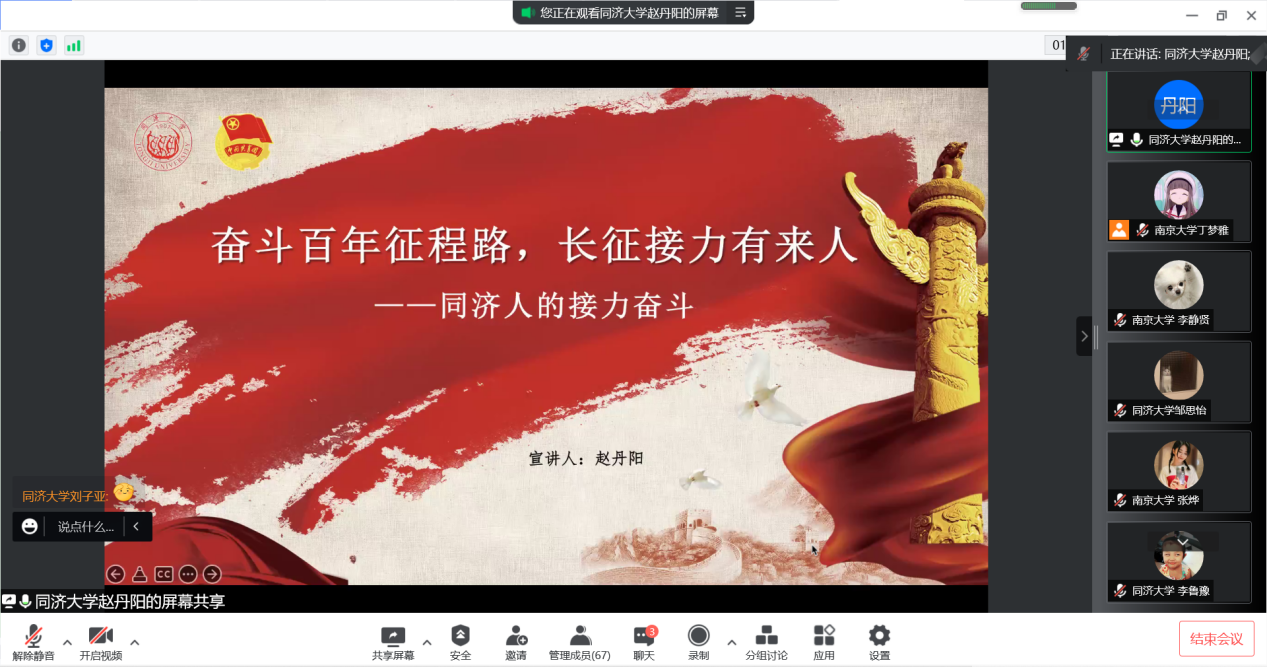 哲学系2021级博士研究生张玮怡为两支部成员带来“旗杆立、旗帜飘——南大校史中的爱国情怀”主题宣讲,同济大学赵丹阳同学就同济大学校史向两支部成员作“奋斗百年征程路 长征接力有来人”主题宣讲。