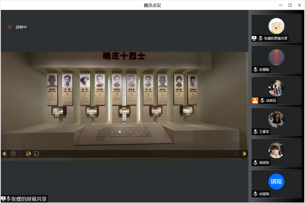活动第一项,由第二党小组同学通过VR全景方式带领大家线上参观雨花台烈士纪念馆,与大家一同走进了为求民族解放,同侵略者进行斗争的革命历史,聆听了无数仁人志士壮烈牺牲的英雄事迹。首先,张蝶同学带领大家参观了雨花台烈士纪念馆基本陈列厅的第一部分“光荣北伐革命先锋”,介绍了革命先锋金佛庄、成律等烈士的生平和革命故事,他们在北伐中英勇奋战成为了雨花台最早的革命烈士。紧接着,丁政方同学带领大家参观了陈列厅的第二部分“力挽狂澜前仆后继”,何宝珍、毛福轩、朱杏南、谢文锦、顾衡、石璞、袁咨桐、邓演达等烈士英勇就义,还有更多的人甚至没有留下姓名。最后,由徐政田同学带大家参观了第三部分“奋起抗战中流砥柱”和第四部分“迎接黎明血沃新天”,介绍了在抗战期间涌现的如罗登贤、孙晓梅、皖南三烈、北平五烈士等奋起抗战的一大批烈士们,他们是革命继续前进的中流砥柱。在中国革命的漫漫长夜中,他们每一个人都是一颗闪亮的星辰,照亮了中国革命继续前行的道路,鼓舞和激励共产党人和亿万人民为实现伟大理想而斗争不息。今天我们在这里回顾雨花英烈的英勇事迹和崇高精神,这也将成为鼓舞我们为实现中华民族伟大复兴中国梦不懈前行的强大精神力量。
