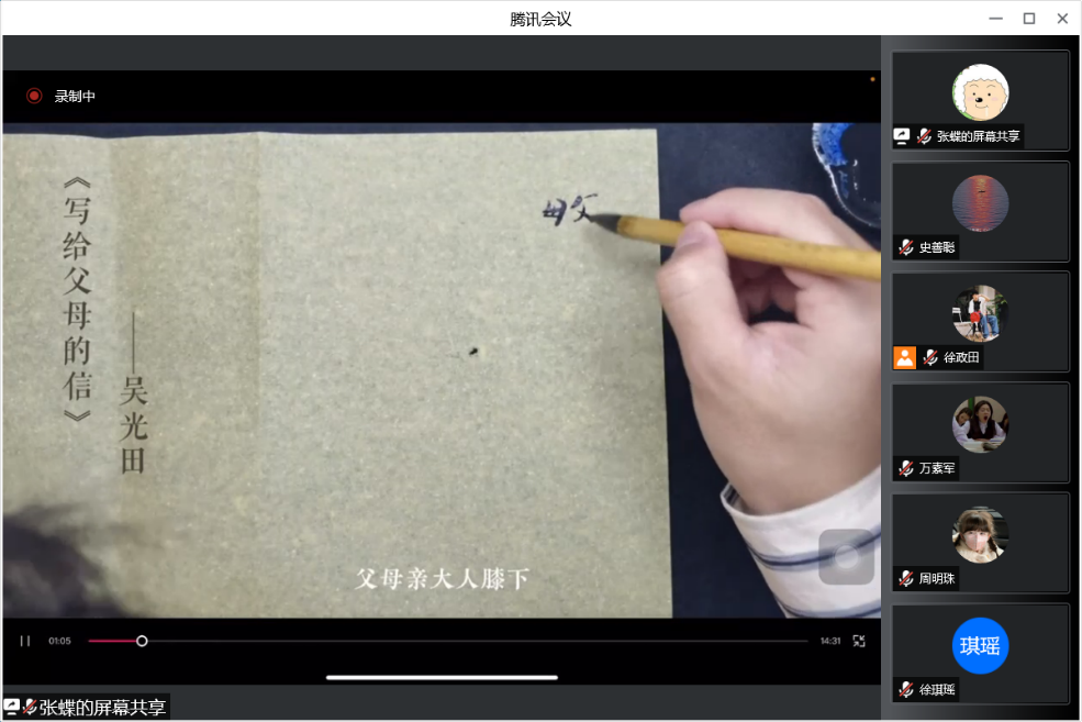 该环节,党支部成员们一同观看了由第二党小组拍摄的家书诵读视频,视频尚未播放完毕,就在支部群内收到了党支部成员们的热烈反响,大家纷纷表示,为认真制作的视频和一封封情真意切的家书所感动。