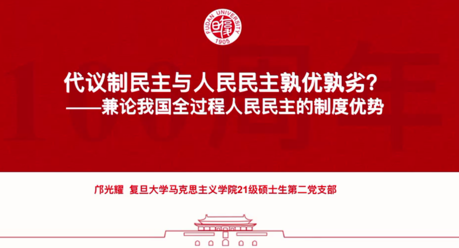 2021级硕士生第二党支部代表邝光耀同志发言,他的发言主题是“代议制民主与人民民主孰优孰劣?——兼论我国全过程人民民主的制度优势”。邝光耀同志通过对代议制民主与人民民主的对比,突出了我国人民民主的优势,增强了同志们对两会主题中全过程人民民主的认识。