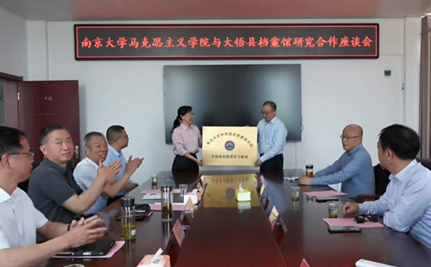 在大悟县档案馆,我院老师与相关负责同志就“新四军第5师和中原突围研究资料”等展开了座谈。双方进行了深入交流,达成了“院馆合作 互补共赢”的共识,签署了合作协议书,并举行了“南京大学中共党史党建研究院实习基地”授牌仪式。