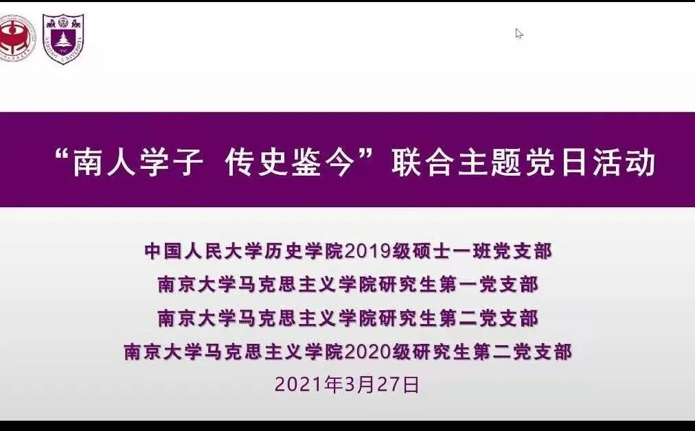 为庆祝建党100周年,进一步增强“四个意识”,坚定“四个自信”,真正做到学史明理、学史增信、学史崇德、学史力行, 3月27日晚,我院研究生第一、二党支部、2020级研究生第二党支部与中国人民大学历史学院2019级硕士生一班党支部开展“南人学子 传史鉴今”线上联合主题党日活动,我院研究生第一党支部书记崔兴红担任主持人,四个支部全体党员共同参加。