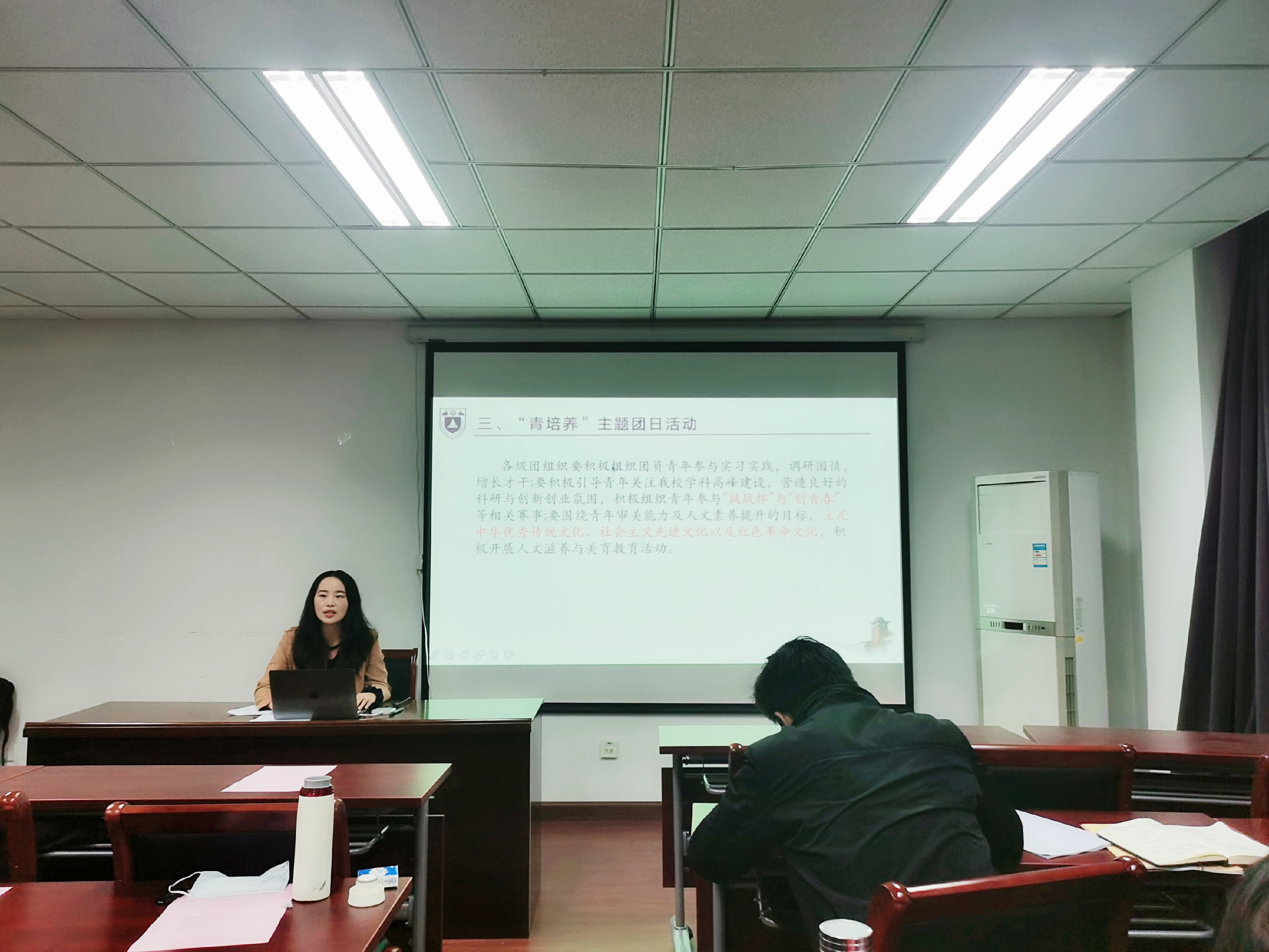 院学生团委副书记谢宇嘉宁以“凝心聚力,砥砺奋斗,在团组织建设中敢担当善作为”为题,对新学期主要团组织工作进行布置,她首先总结了近期团组织工作的开展情况,然后对“青引领”、“青组织”、“青培养”、“青服务”四项主题团日活动的开展进行了指导说明,同时号召大家极依托“学习强国”、“纽扣课堂”、“青年大学习”等学习载体,开展集学理性与趣味性相统一的团日活动,做敢担当善作为的团组织干部。