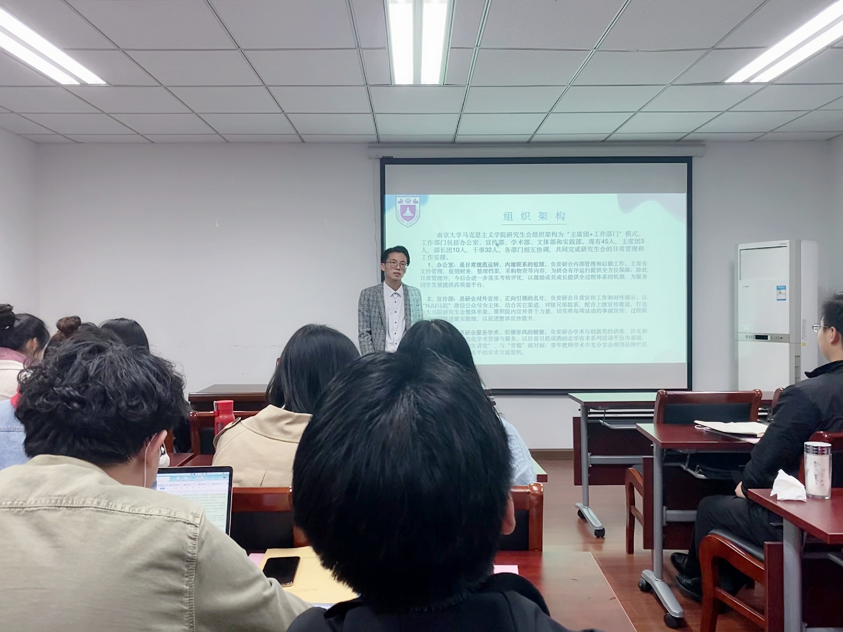 随后,院研会主席石永程从组织架构、学期工作概述、工作完成情况、未来工作计划四个方面对院研究生会的学期工作进行了回顾与展望,重点概述了研会各部门的具体职能与活动分工安排,同时汇报了研会未来的重点工作。他指出,研会各部门要加强团结协作,砥砺前行共奋进。