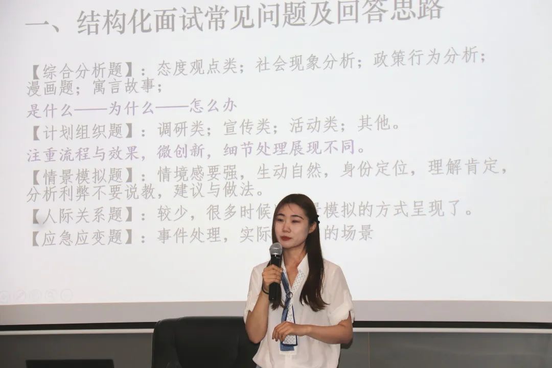 本环节中,现场同学分别从两位学姐准备的六道结构化面试题目中选择了人际关系题、综合分析题与情景模拟题进行作答。王良子学姐和苗润雨学姐对实战同学的回答思路都给予了肯定,同时给出一些改进意见,如在讲述故事时可凝练美化语言,回扣本人观点,让故事不只是故事。最后苗润雨学姐对其中一道情景模拟题讲解回答思路,并进行示范作答,生动诠释了此类题型审题与自我定位的重要性,以及如何在情境题中构建框架。