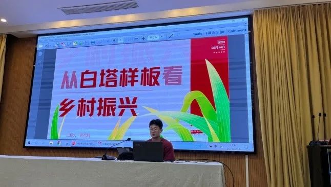 座谈会开始,马克思主义学院2021级本科生团支部成员蔡恺翔同学以《从白塔样板看乡村振兴》为题展开分享交流。他从白塔村样本引入,从产业兴旺、生态宜居、乡风文明、治理有效和生活富裕五个方面展开对白塔村乡村振兴的路径进行了深入的探究。接着,马克思主义学院2021级硕士生第二党支部成员黄梦茜同学进行《协商治理助推乡村振兴——以安徽省天长市郑集镇向阳社区为例》的主题宣讲。黄梦茜从我国基层治理的一个社区为案例,通过对该社区协商治理的政策导向、治理模式、取得成效的分析,以小见大地挖掘在我国乡村振兴背景下基层民主制度建设的重要作用。