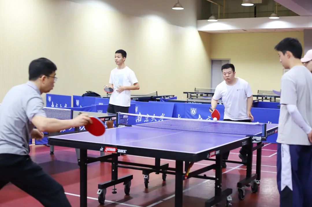 首先进行的男子单打对决便紧张激烈、扣人心弦、“好球”不断。削球、扣球、旋球、弧线球,挥拍落拍间尽显对力量、节奏和落点的透彻掌控。所有选手沉着应战、奋力拼搏,大家献上了一场场视觉的盛宴:有武海宝老师和崔舒畅同学高潮起伏的强强对决,彼此你来我往、见招拆招;也有崔晋同学以精准发球、娴熟接球、迅猛扣球连赢数轮,用完美的防守和绝杀点燃赛场,都将国球的魅力展现得淋漓尽致。最终,崔晋同学斩获本场比赛冠军,武海宝老师和贾一帆同学并列男单亚军,张显玉同学获得了比赛季军。