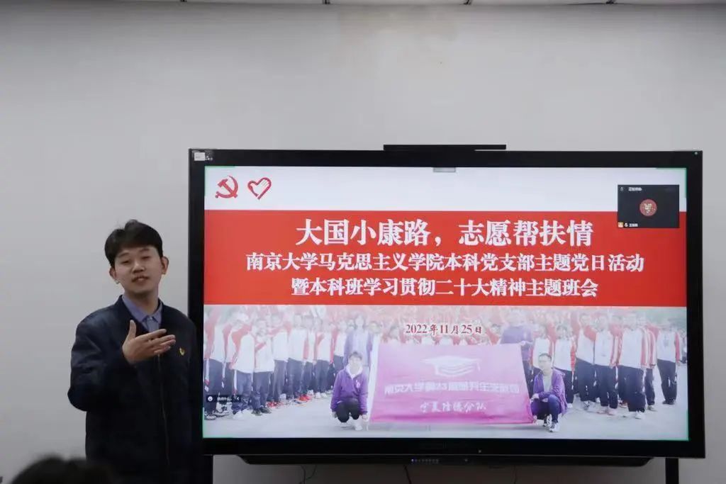 活动的最后,本科生党支部宣传委员史善聪对本次主题活动进行总结。他对王泽森和贾姣妹同志的发言内容进行了总结,并为大家分享了南京大学校友袁辉老师的支教故事,袁辉校友十年如一日在祖国的大山深处支教,无怨无悔,将青春奉献给教育事业,让梦想的力量感染每一个大山深处的孩子。随后,他号召同学们向几位前辈同志学习,提升自己的精神境界,锻造自身修养,做一个纯粹的人、摆脱低级趣味的人、为人民服务的人,去基层建功、到一线立业,在时代的潮头前展现南大智慧和南大担当,让青春之花绽放在祖国需要的地方。