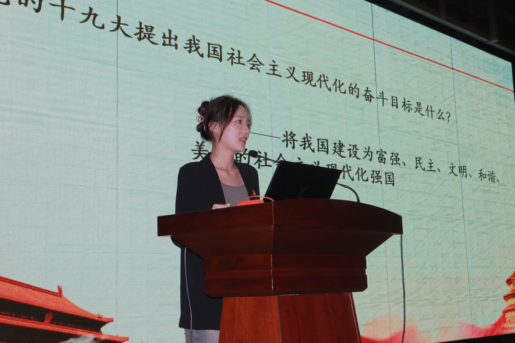 覃钰淇同志讲述了党的十九大,首先介绍了十九大的会议安排形式的创新之举,随后通过对《十九大报告》中对十九大的主题、对我国主要矛盾的变化、新的历史方位以及我国社会主义现代化的目标的论述进行介绍分析,对十九大精神进行了解读。学习十九大精神,为夺取新时代中国特色社会主义伟大胜利、实现中华民族伟大复兴的中国梦、实现人民对美好生活的向往继续奋斗,具有重大现实意义和深远历史意义。最后覃钰淇同志也向现场同学提出了关于问题,并送上了马克思主义学院准备的精美礼品,同学踊跃举手发言,讨论热烈。
