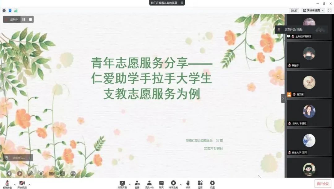 习近平总书记曾指出“奋斗是青春最亮丽的底色,行动是青年最有效的磨砺。有责任有担当,青春才会闪光。”为深入学习习近平总书记关于青年工作重要指示精神,引领青年党员以崇高的理想信念、高强的专业本领、自觉的担当精神积极投身社会建设,努力成为担当民族复兴大任的时代新人,2022年8月8日晚,马克思主义学院2021级硕士生第二党支部与安徽仁爱公益基金会、北京师范大学“冰雪有余情”北京冬奥会遗产转化实践队联合开展“扬实践风采,展青年担当——2021级硕士研究生第二党支部暑期主题党日活动第1期‘志愿精神’实践风采展示。”会议由2021级硕士生第二党支部成员丛政同志主持。