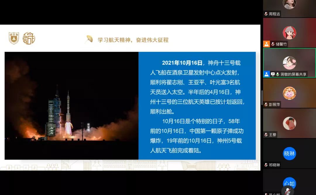为喜迎南京大学120周年校庆,大力弘扬科学家精神,引导学生党员建言献策、贡献智慧、广泛参与、群策群力,传承南大精神、展现新风貌、彰显新成就。2022年4月24日晚19:00,南京大学马克思主义学院2020级硕士生第一党支部通过腾讯会议开展“百廿荣光·寻梦起航——弘扬科学家精神,迎接百廿校庆”线上主题党日活动,马院2020级硕士生第一党支部全体党员及入党积极分子参加此次活动。本次活动由马克思主义学院2020级硕士生第一党支部书记储馨竹主持,2020级硕士生第一党支部宣讲团讲师蒋敏带来了关于“学习航天精神,奋进伟大征程”的党课宣讲。