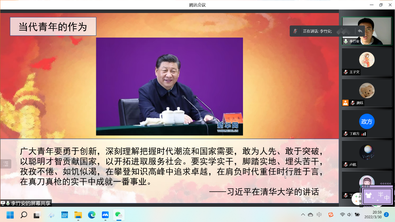 弘扬科学家精神,奋进强国新征程。2022年3月30日,为迎接党的二十大召开,在南京大学建校120周年校庆之际,马克思主义学院21级硕士研究生第一党支部邀请博士生讲师团讲师李竹安共同开设“党史校史小课堂”,学习科学家精神,迎接百廿校庆,跟随南京大学胡福明教授的脚步,围绕“关于真理标准问题大讨论”开展线上党日活动,活动由马克思主义学院2021级硕士生第一党支部书记唐钰同志主持。活动主要分为四个环节,分别为博士生讲师团党课宣讲、第一党小组组织学习、各党小组学习讨论和视频展示。