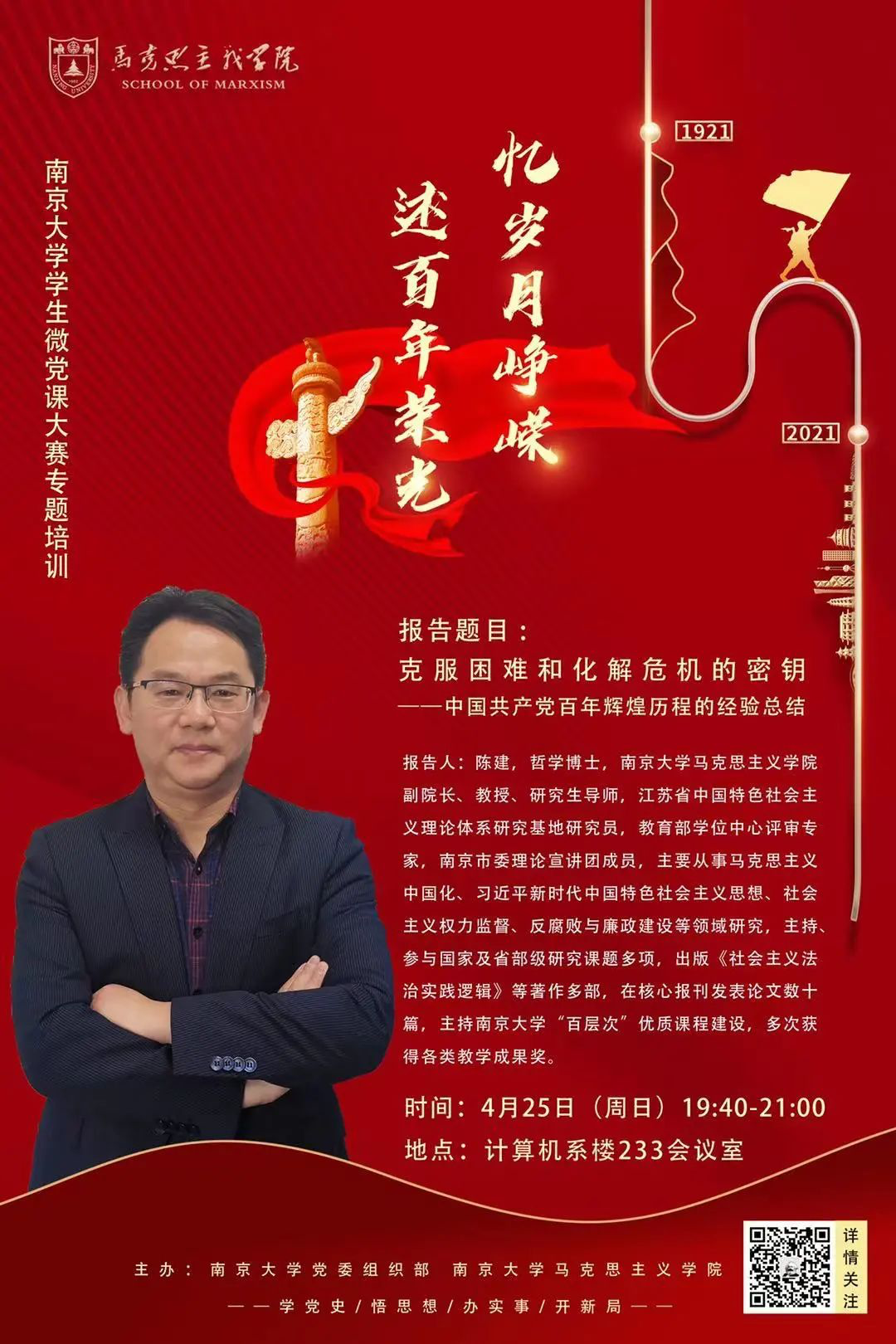 经过精彩激烈的角逐,“忆岁月峥嵘,述百年荣光”南京大学学生微党课大赛院内初赛环节已落下帷幕,即将进入复赛环节。为了进一步加强大家对百年党史的学习领会,提升党课授课技能,校党委组织部和马克思主义学院于4月25日(周日)特安排了两场培训讲座,邀请专家名师进行专业辅导,帮助同学们打磨微党课作品,提升微党课质量。